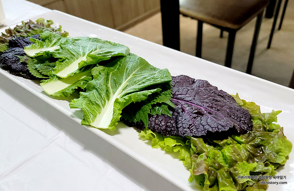 밥이 나오기도 전에 싱싱한 채소에 고기를 싸서 먹었습니다.