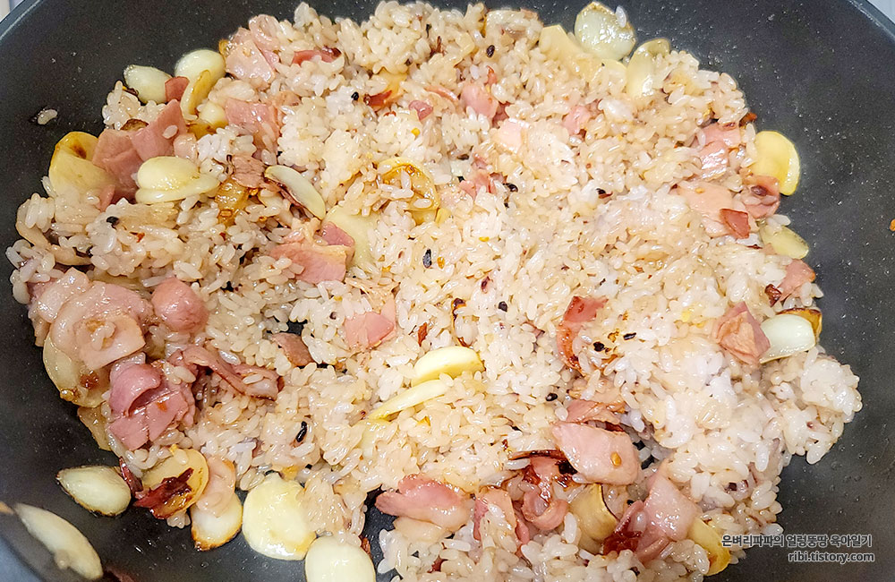 밥을 넣어 고루고루 썩으면서 볶아줍니다.