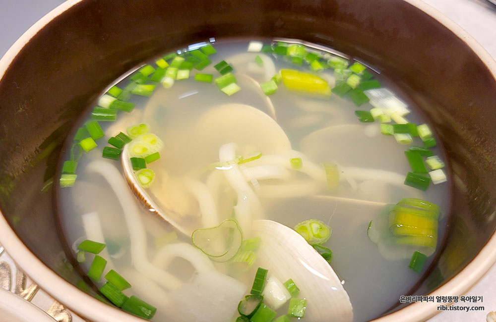 다른 반찬 필요 없이, 전날 먹다 남은 백합탕에 가락국수면을 넣어 국으로 곁들였습니다.