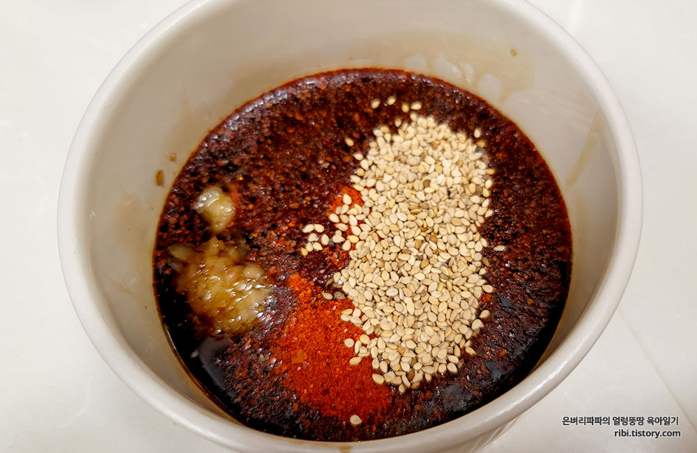 간장을 기본으로 식초, 매실당, 고춧가루, 참깨, 후춧가루, 참기름을 넣고,