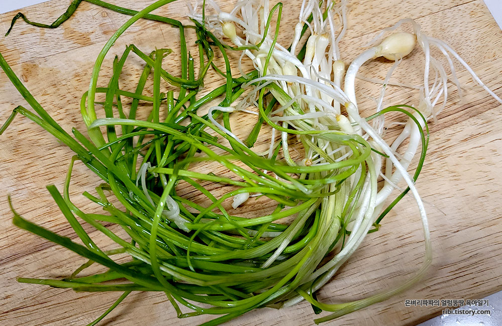 순두부가 끓는 동안 냉장고에 있던 달래를 꺼내어 손질하고 달래장을 만들었어요.