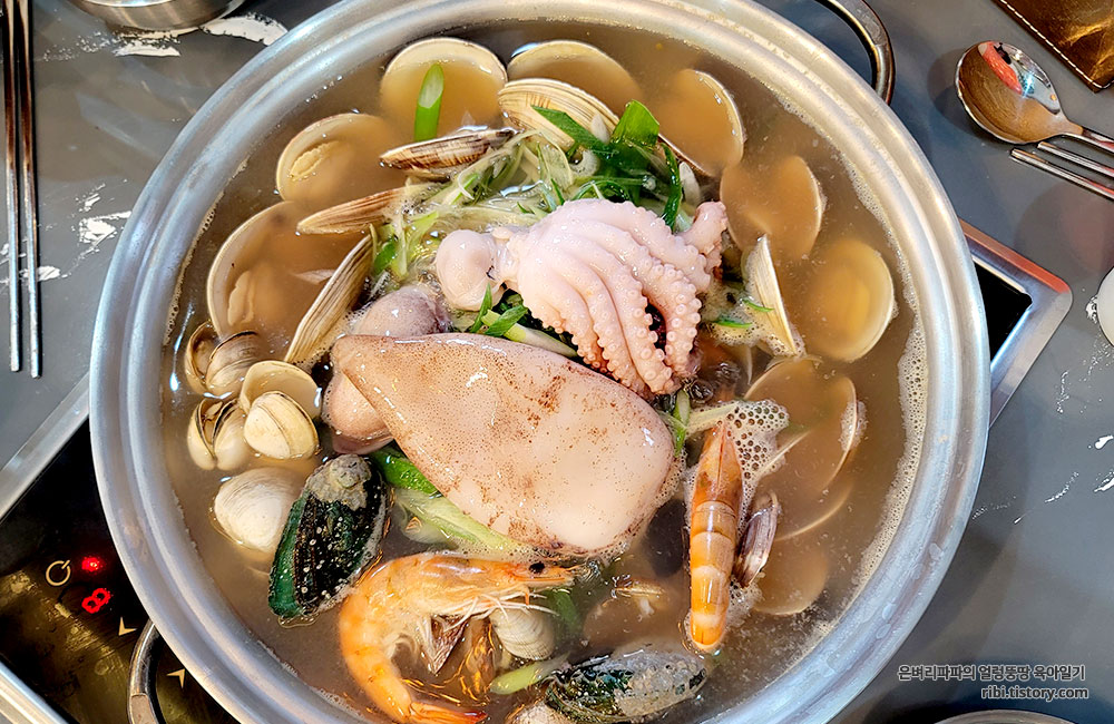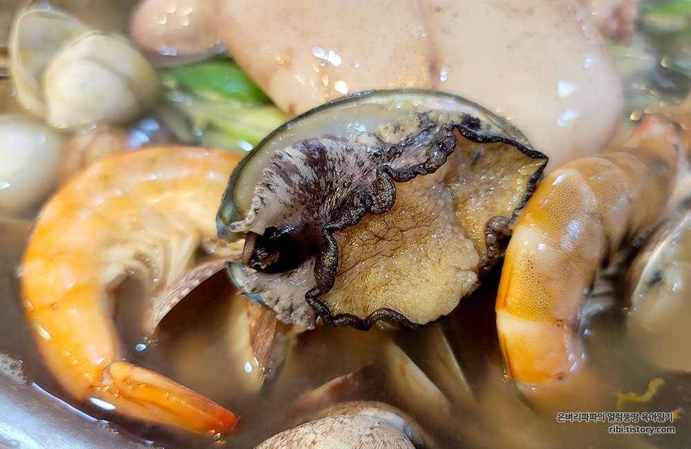 조개를 한번 끓여서 나왔고, 전복과 오징어는 생물 그대로입니다.