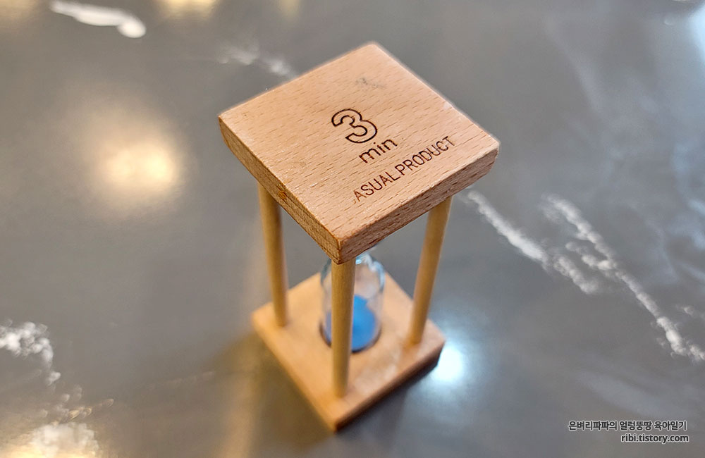 이를 놓칠세라 아들 녀석은 모래시계로 시간을 측정하기 시작합니다.