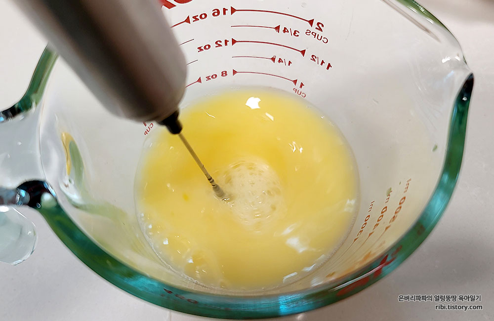 물과 계란은 거품기로 섞어줬어요.