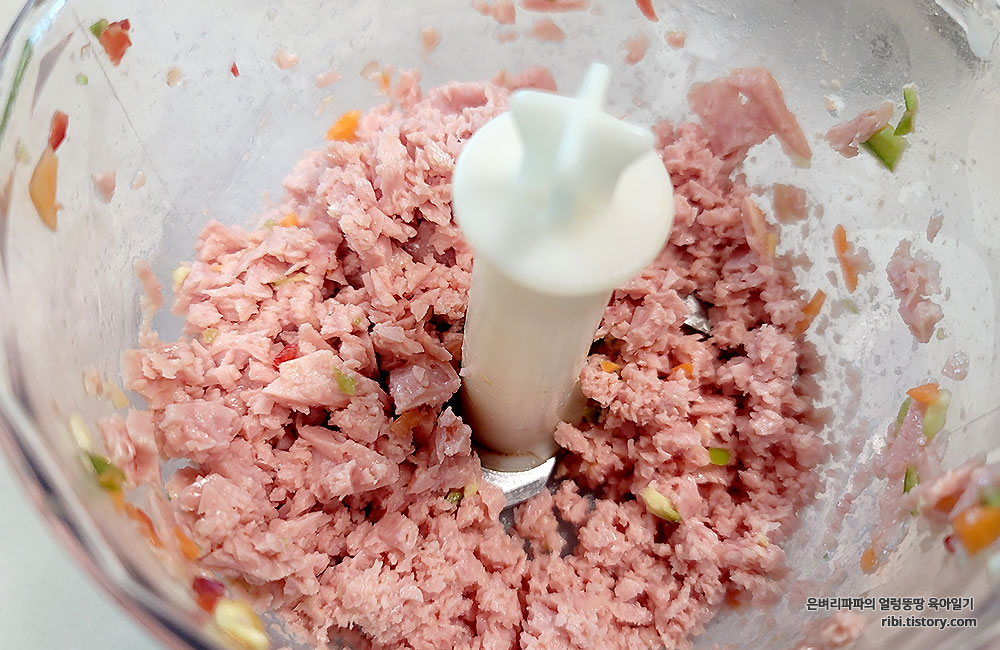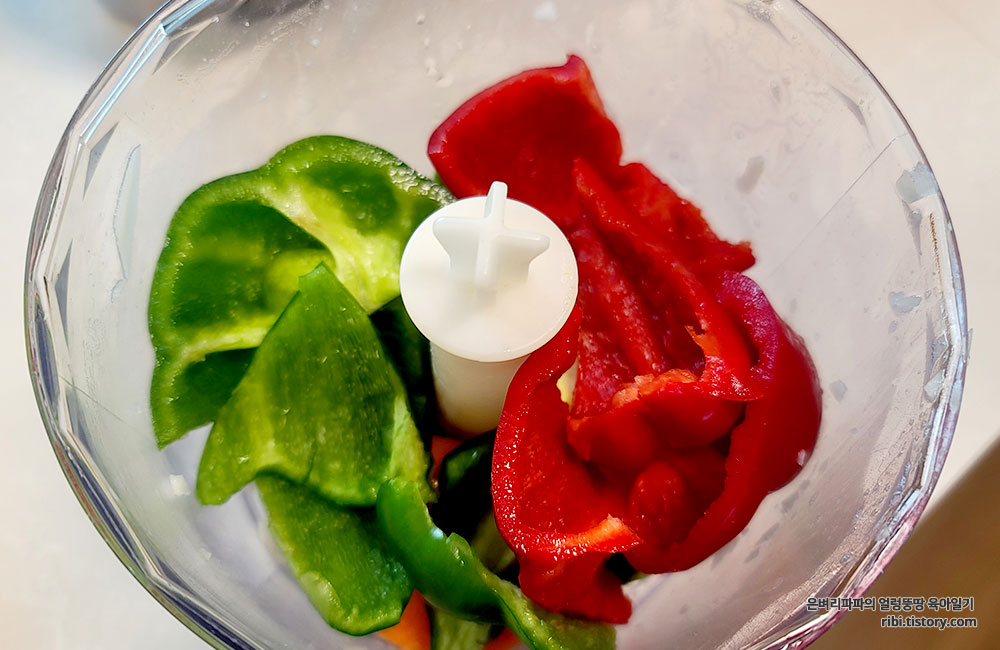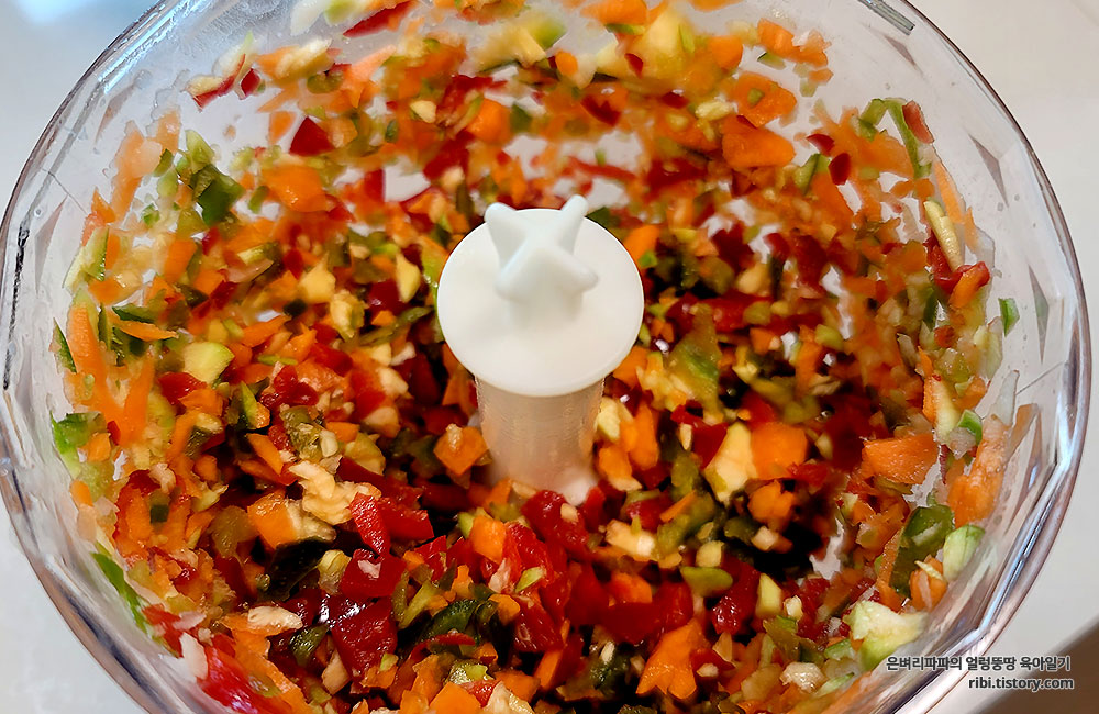푸드 푸르세서를 이용해 채소를 다질땐 버튼을 툭~ 툭~ 눌러주는 게 포인트예요.
