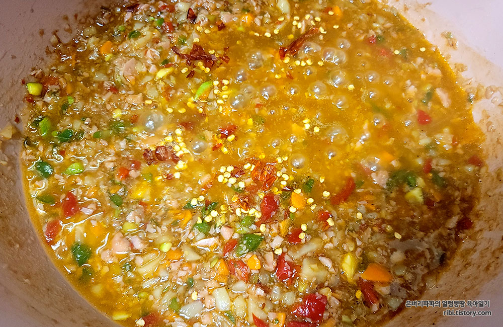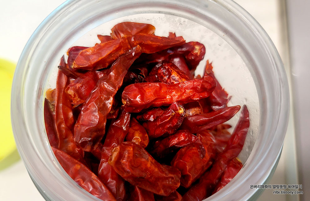 바짝 말라있는 페페론치노 3개를 손으로 부셔 넣어줬습니다.