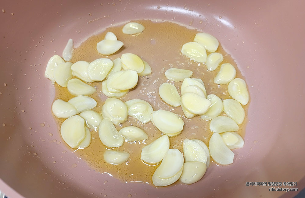 편으로 썰어 놓은 마늘을 듬뿍넣어 볶아줍니다.