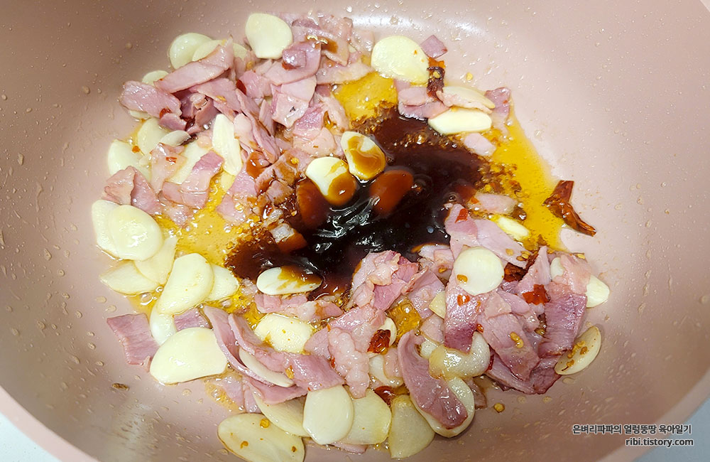 마늘을 볶다가 베이컨을 넣어 다시 볶아줍니다.