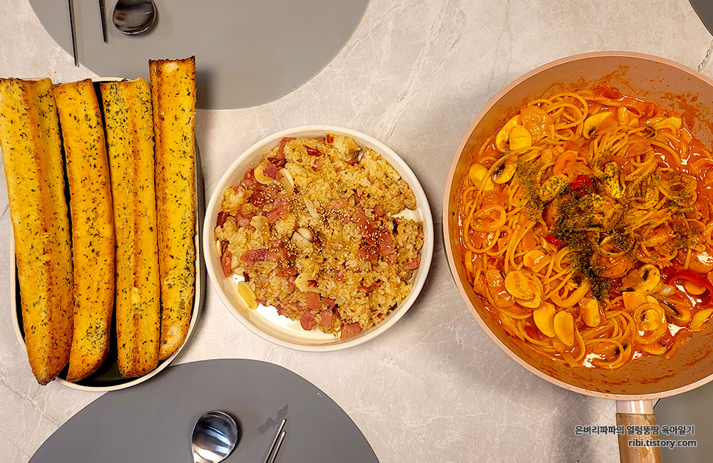 마늘바게트빵과 마늘베이컨 볶음밥, 마늘과 베이컨이 들어간 로제토마토스파게티....