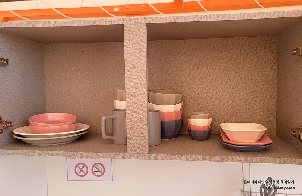 싱크대 상부장에는 그릇과 냄비가 수납되어 있습니다.
