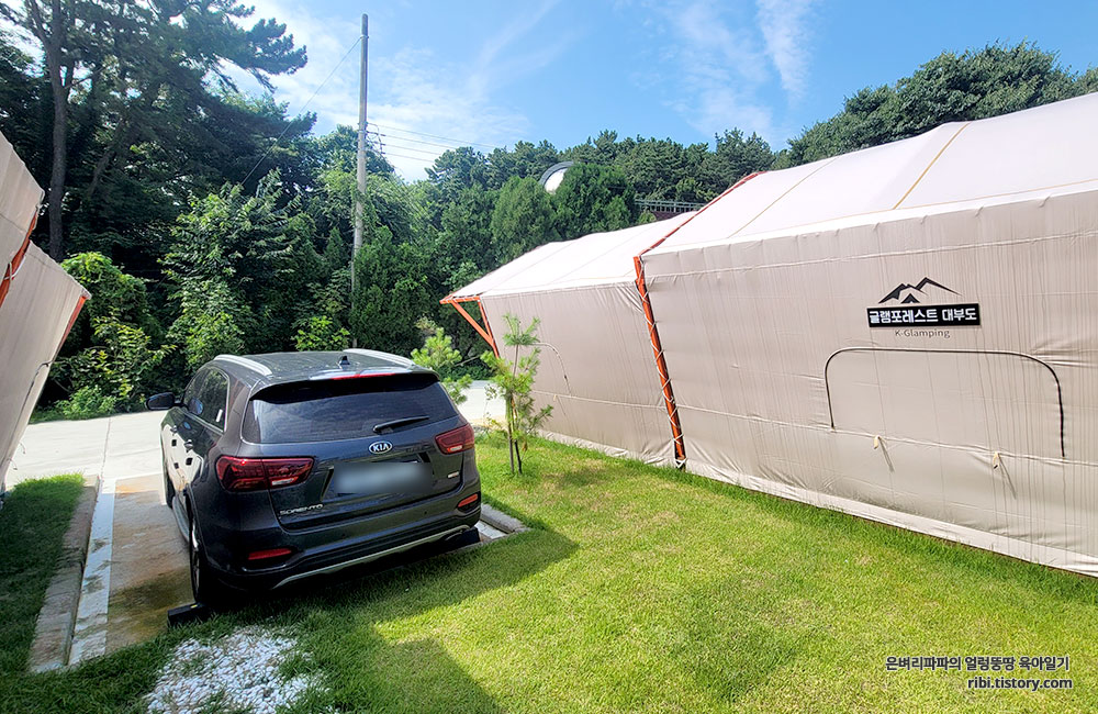 글램핑장이다 보니, 숙소 바로 옆에 주차를 할 수 있더라고요.