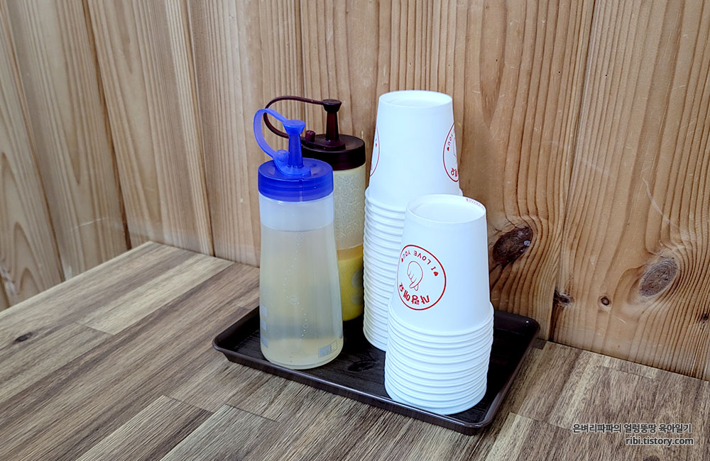 주문을 하고, 테이블을 둘러보니 식초와 겨자... 그리고 종이컵이 놓여 있습니다.