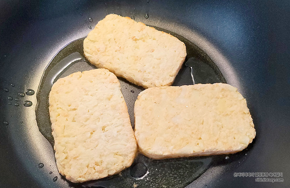 냉동상태였던 해쉬브라운이 노릇노릇 구워지면 잘 부서집니다.^^