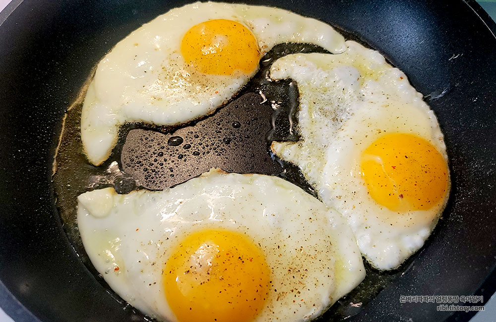 계란프라이도 3개, 노른자가 완전히 익지 않도록 반숙으로 구웠어요.