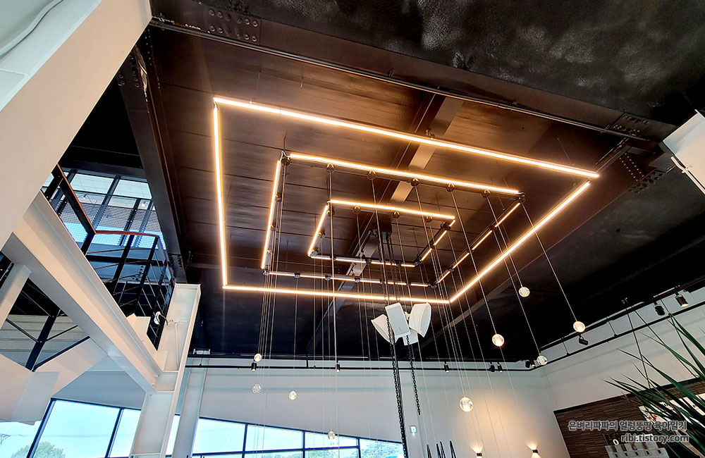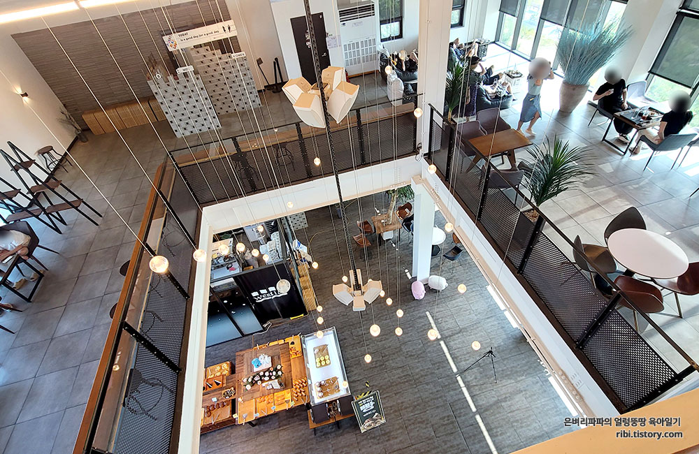 카페 중앙에는 계단과 함께 높은 층고와 은은한 조명이 인상적입니다.