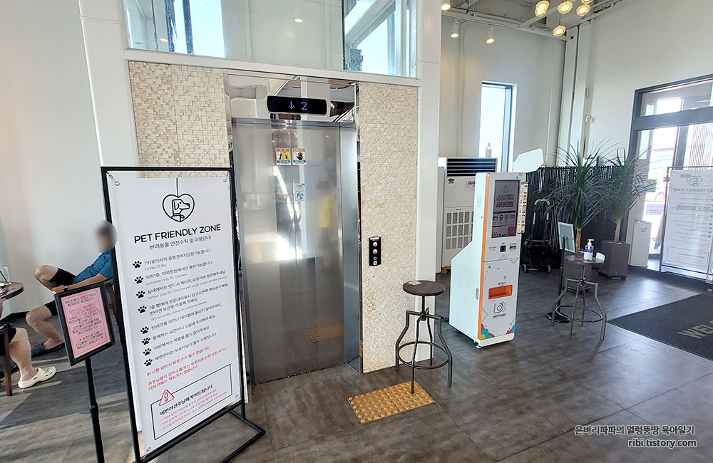 애견동반이 가능한 것인지, 엘리베이터 앞에 안내문이 세워져 있습니다.