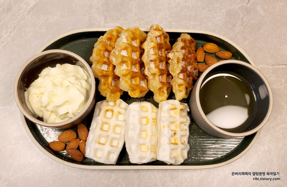 각자 취향에 따라먹을 수 있는 크로플과 가래떡구이가 완성되었습니다.