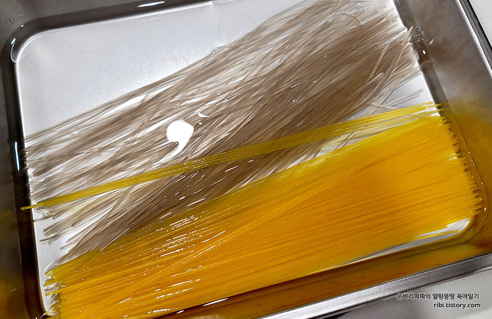 마지막으로 불려놓은 당면과 옥수수면을 넣어 줍니다.