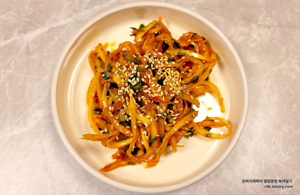 남은 도라지로는 빨갛게 무침을 만들었어요.