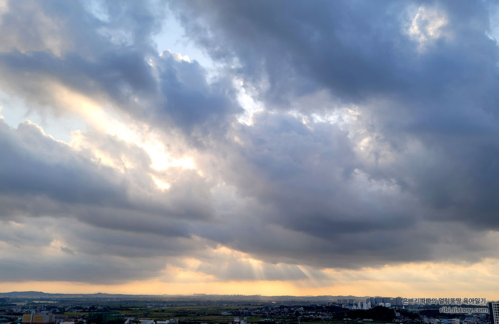비 온 뒤 개인 하늘의 구름사이로 비추는 햇살을 보기도 합니다.
