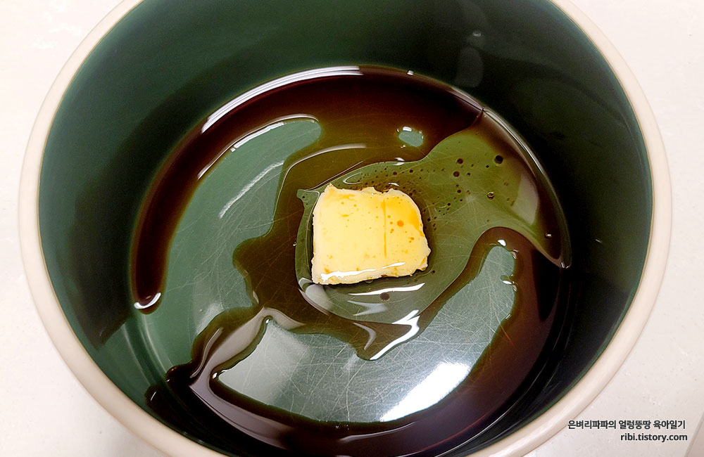 조금 넉넉한 그릇에 버터 한 조각, 양조간장 한 숟가락, 참기름 반숟가락 넣어줍니다.