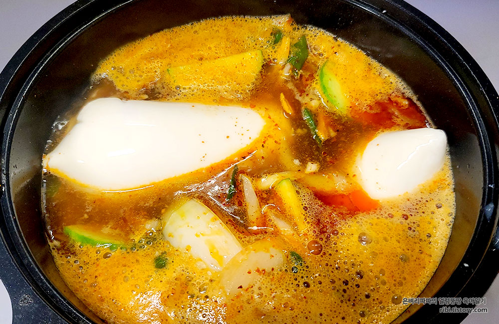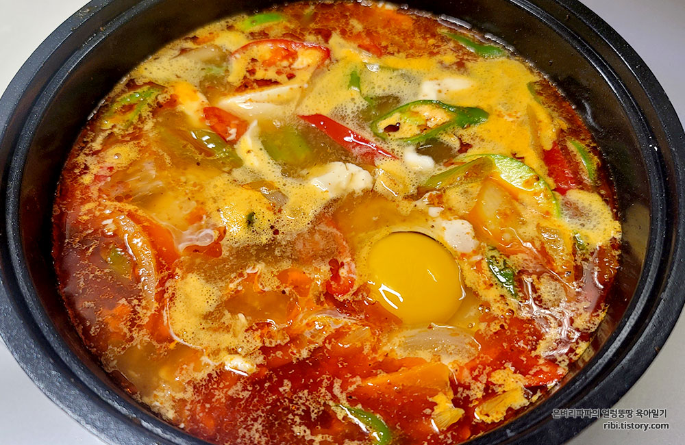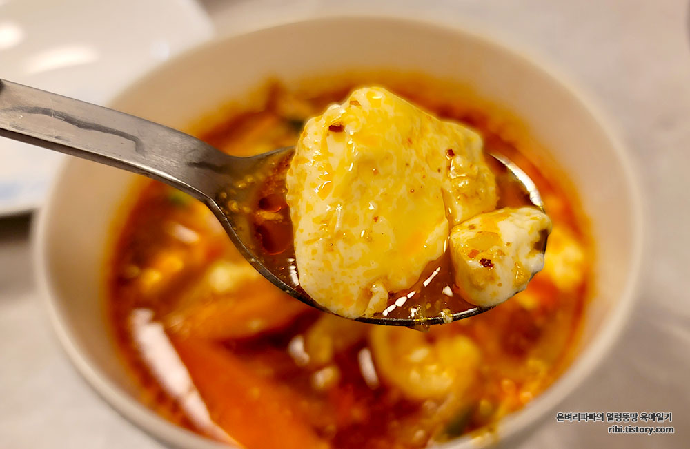일반 순두부찌개보다 국물이 더 빨갛습니다.