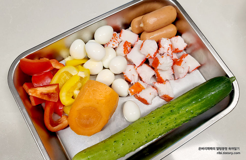 메추리알과 꽃맛살, 소시지를 일부러 준비했어요.ㅋ