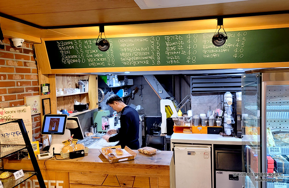 음료 메뉴는 카운터 위 칠판에 분필로 쓴 손글씨입니다.