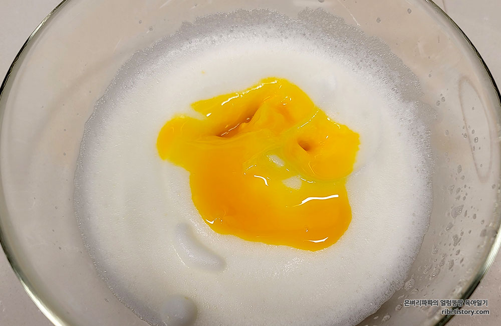 머랭이 어느 정도 만들어지면, 노른자를 잘 저어 머랭에 섞어 줍니다.