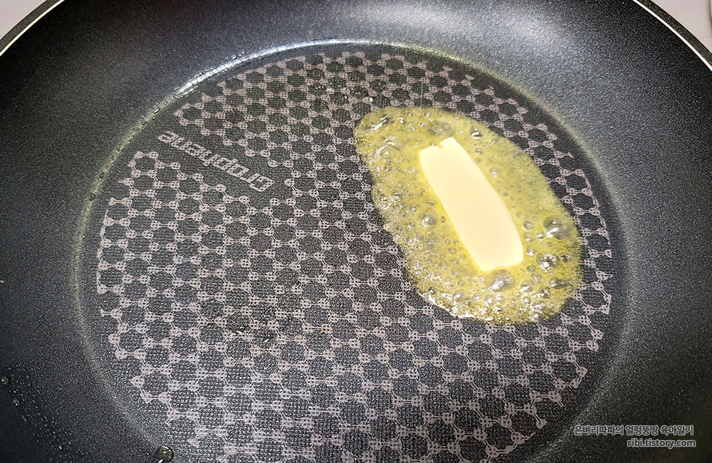 프라이팬에 버터를 녹이고, 만든 계란 머랭을 프라이팬에 살포시 부어줍니다.