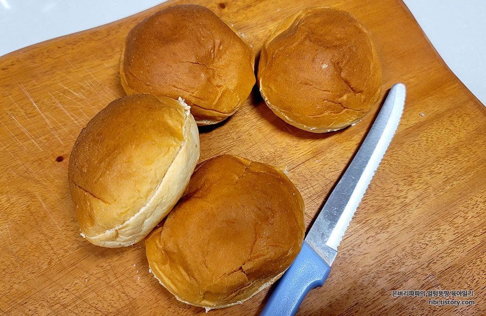 버터는 녹이는 동안, 모닝빵 사이에 버터 덩어리를 넣을 수 있도록 반으로 잘라 줍니다.
