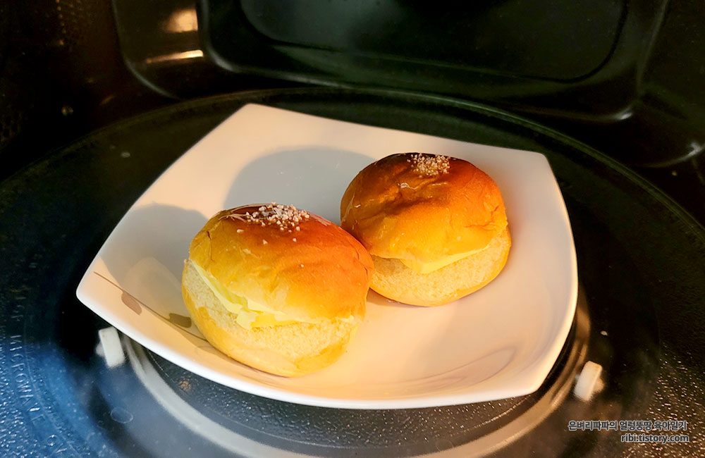 버터를 다 녹였으면, 앙버터용 모닝빵 두 개를 전자레인지로 데워주세요.