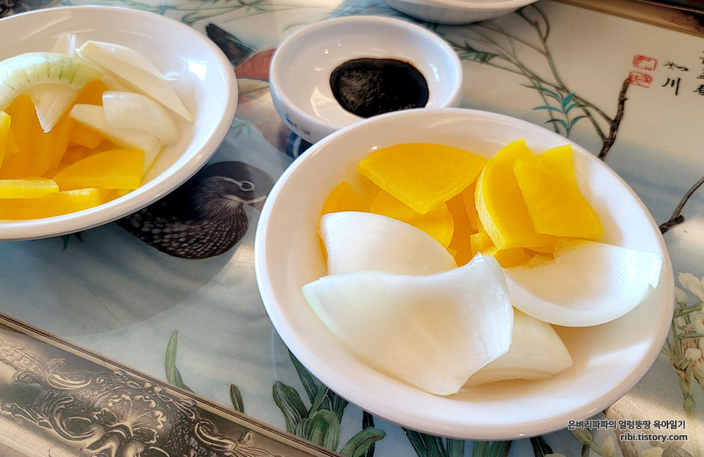 주문과 동시에 단문지와 양파가 나오고, 앞접시가 세팅됩니다.