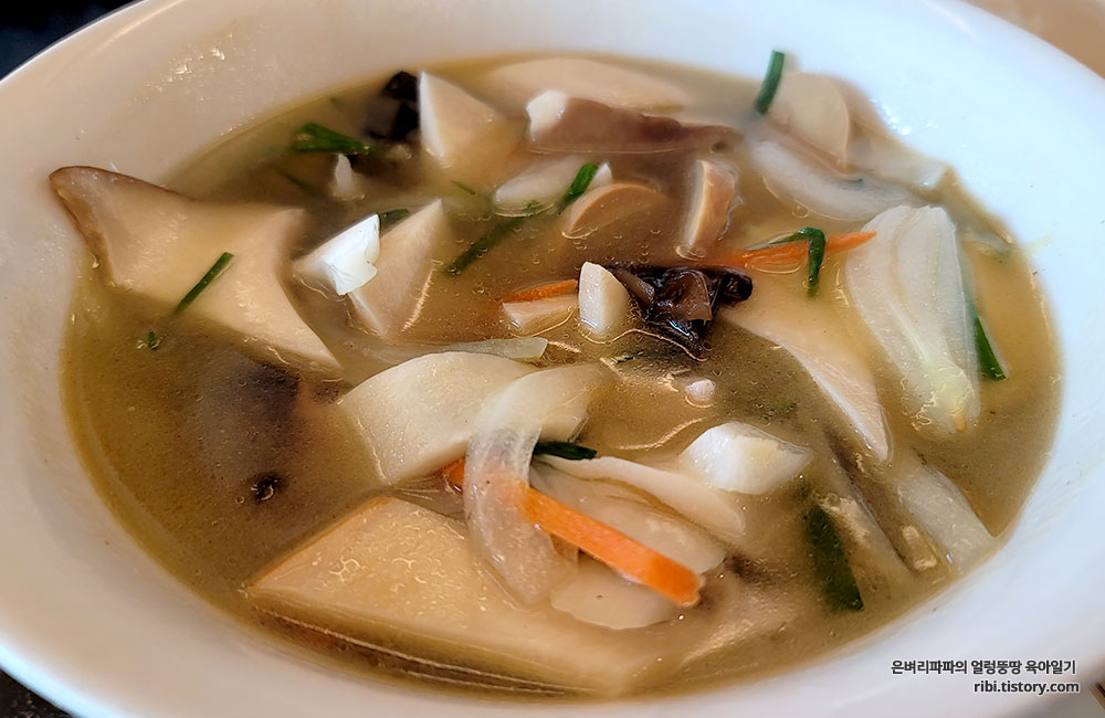 갖가지 버섯이 가득 들어간 버섯짬뽕은 맑은 국물이에요.