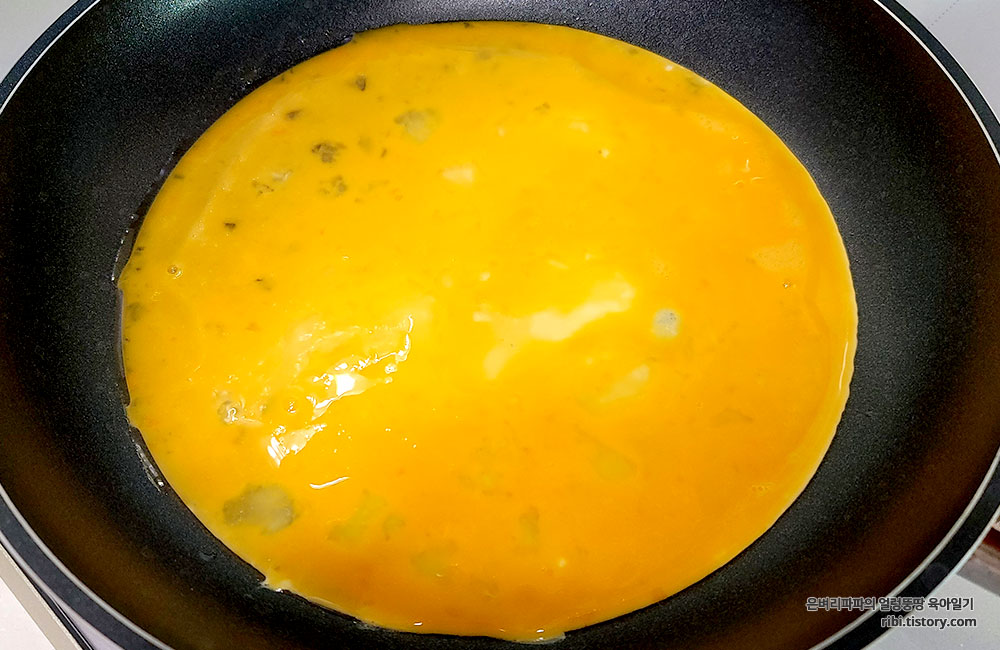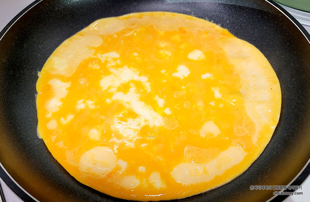 가장 먼저 계란을 잘 풀어 두툼하게 부쳐줍니다.