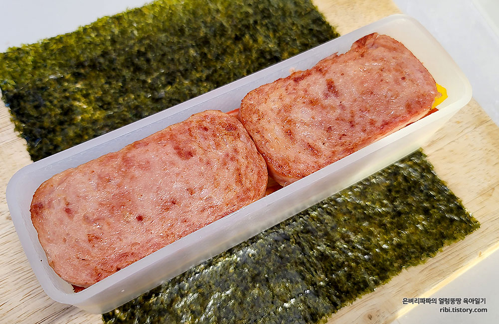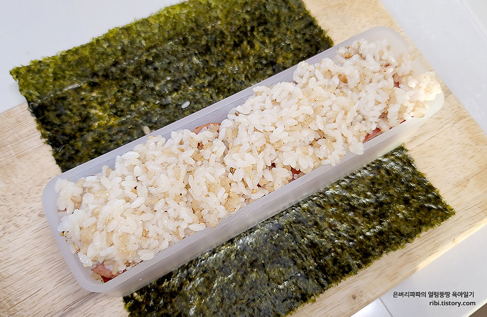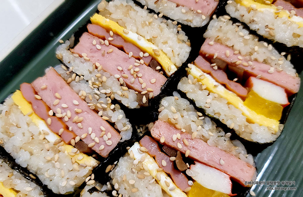 김밥재료를 추가로 넣은 하와이안무스비, 사각김밥으로