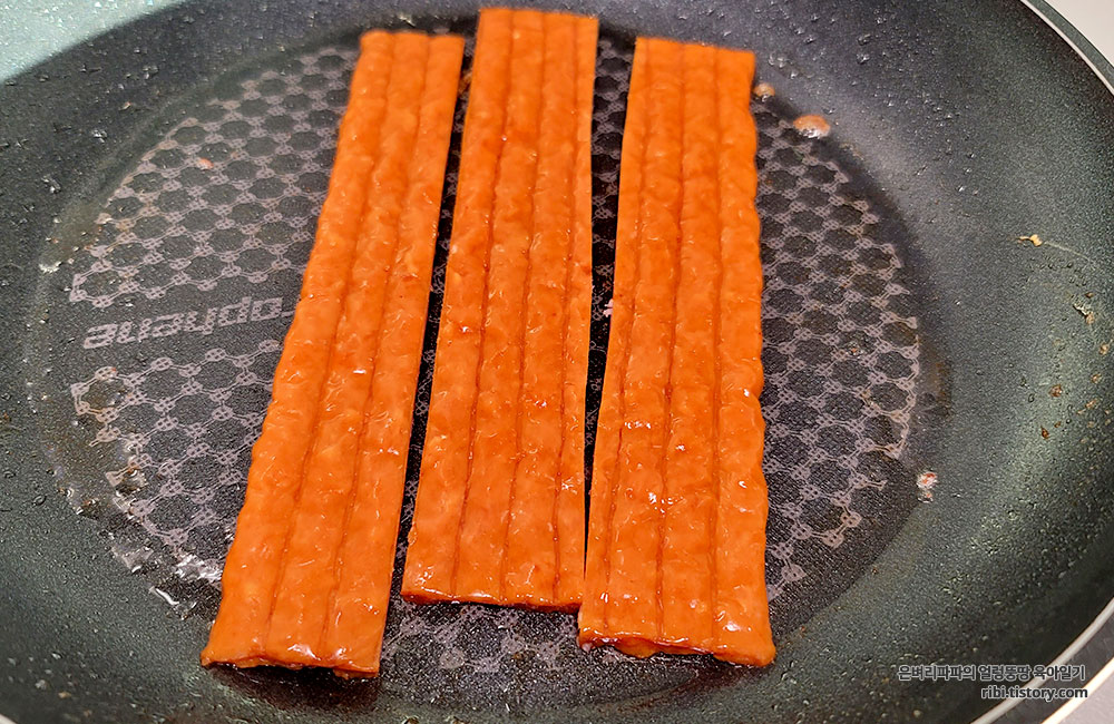 김밥재료 세트에서 꺼낸 김밥용 햄도 3등분으로 잘라 노릇노릇 구워줬습니다.