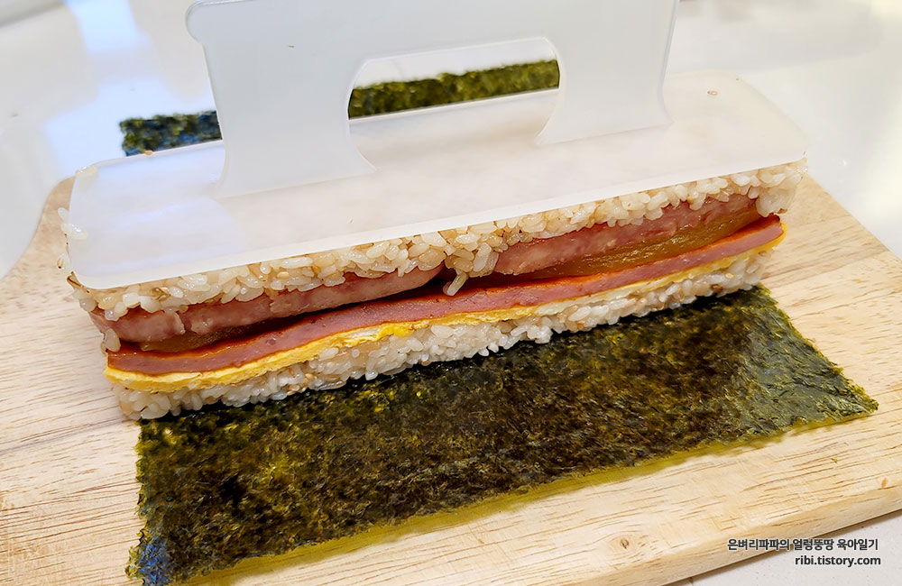 누르개로 꾹 눌러 사각틀을 위로 올리고, 김으로 감싸주면 사각김밥 완성입니다.