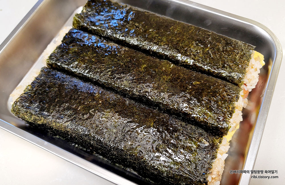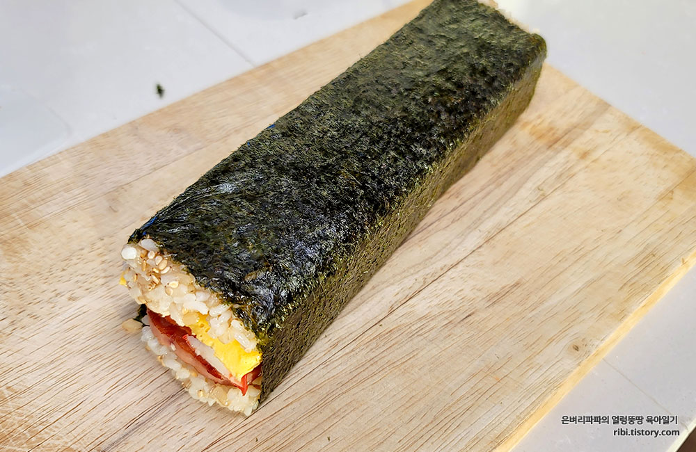 너무 딱 맞는 높이까지 올라간 것인지, 김이 딱 맞게 감싸져서 나중에 칼로 썰때 잘 터지더라고요.