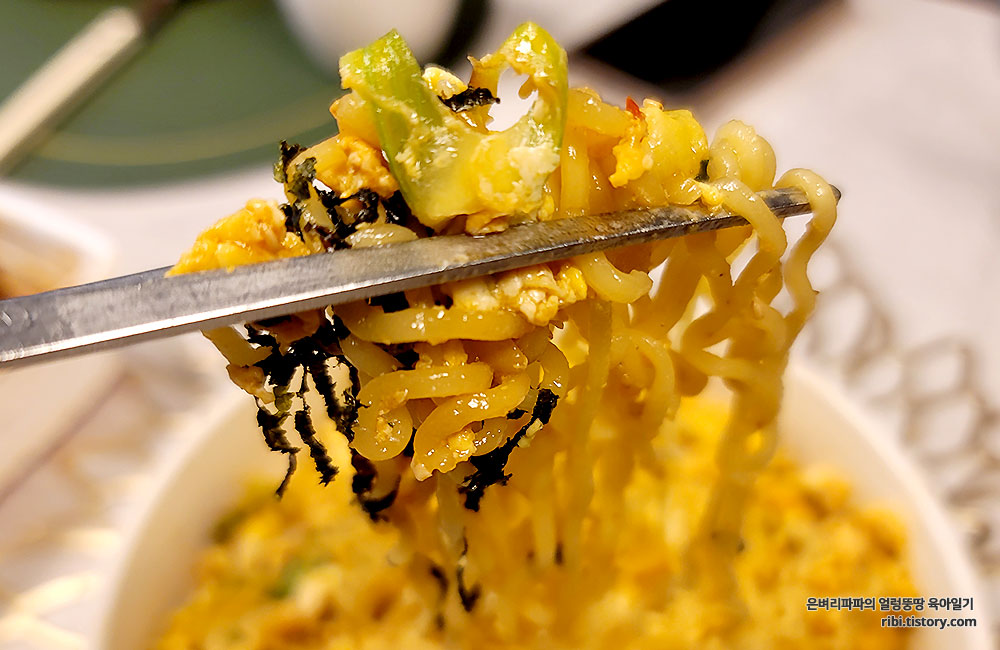 라면 2개 분량에 스프 한 봉지, 그리고 굴소스 한 큰 술 넣어 볶아줬습니다.