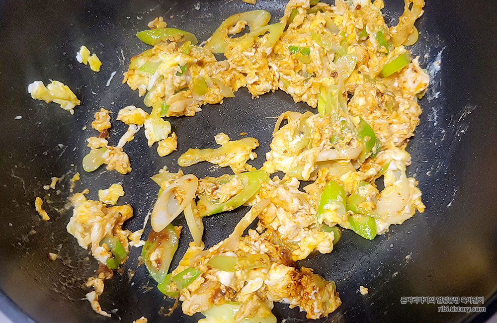 미리 볶아놓은 계란과 잘 버무리듯 다시 한번 볶아주세요.