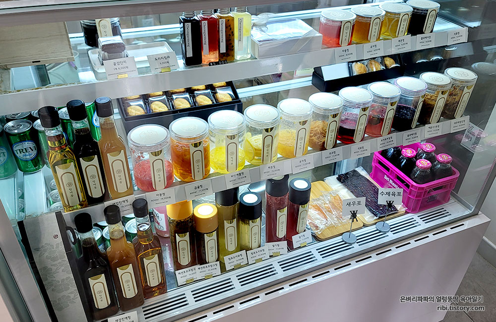 카운터 근처에는 온갖 수제청이 보관되어 있어요.