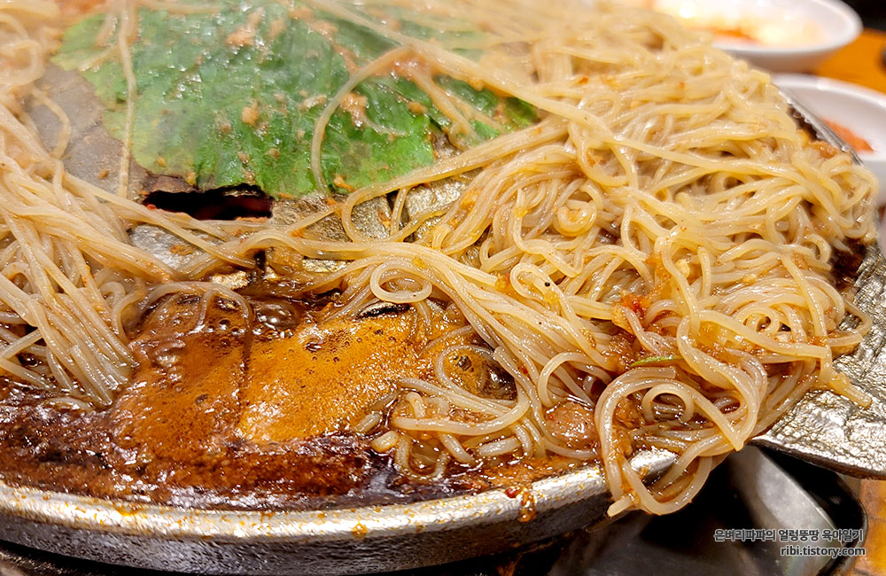 고기를 굽던 불판 위에 상추한장 깔고, 고기 양념이 가미된 면을 불판에 구워 먹는 후식입니다.