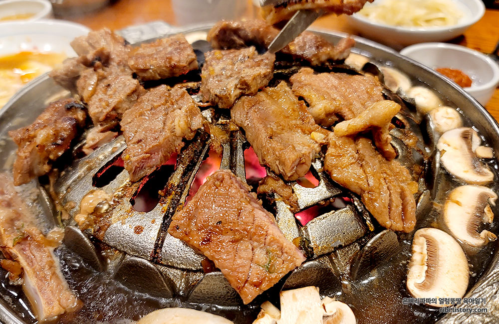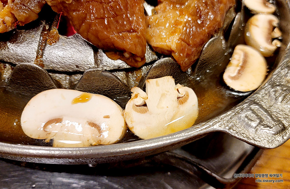 돼지갈비를 숯불 위에 올리고, 버섯은 육수가 담긴 불판 가장자리에 올려 익혀먹는 방식이에요.