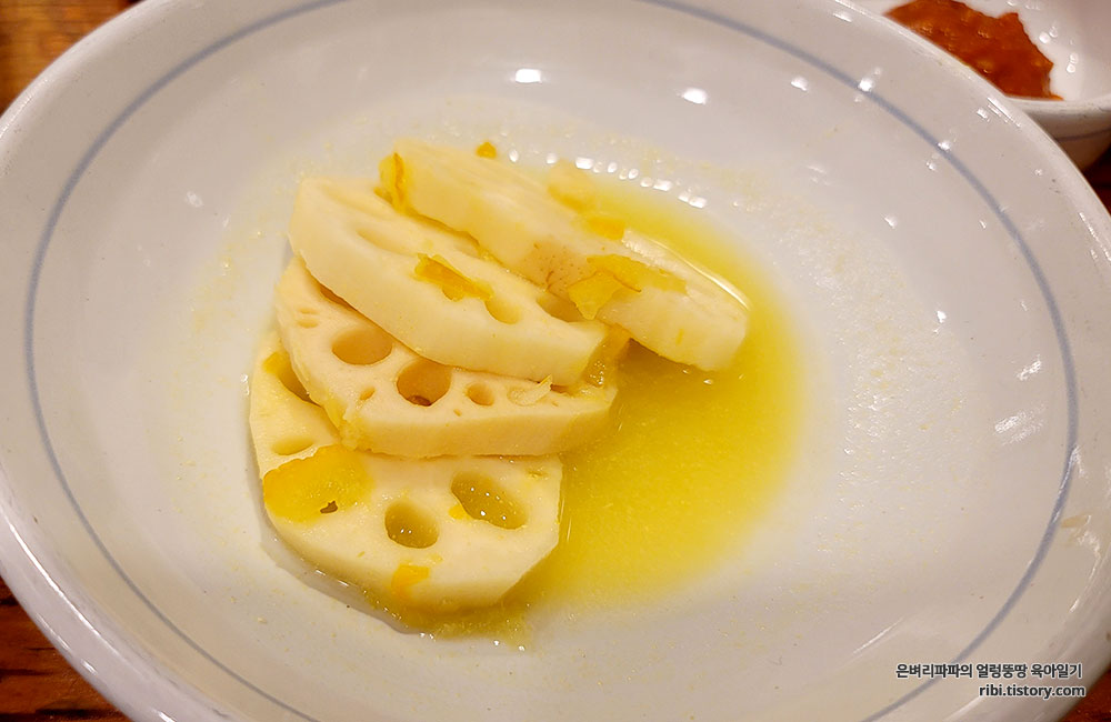 아삭한 식감의 치자와 유자소스를 곁들인 연근도 고기와 아주 잘 어울렸습니다.^^