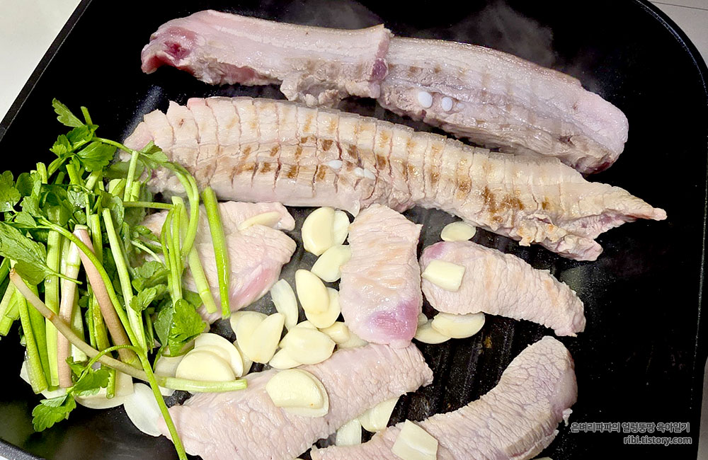 그러는 동안 아이엄마가 삼겹살을 굽기 시작하네요.