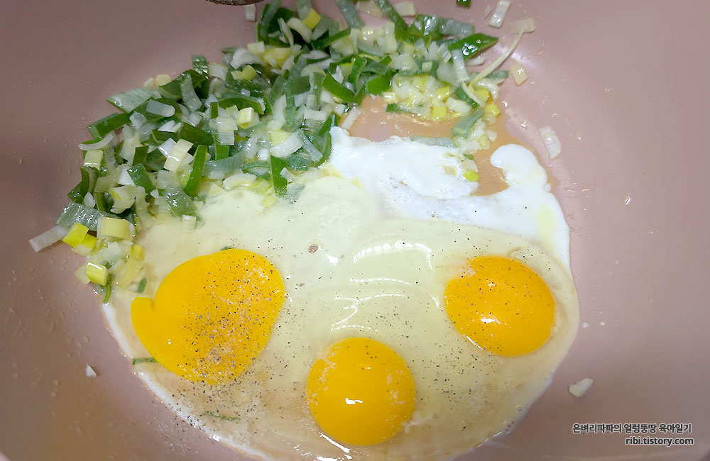 파를 한쪽으로 밀어 놓고 계란을 깨트려 스크램블 만들듯 이리저리 휘저으며 익혀주세요.