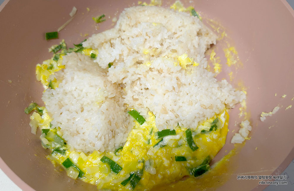 계란이 어느 정도 익으면 밥을 넣고 대파와 계란, 밥이 잘 어우러지도록 이리저리 섞으면 볶아줍니다.