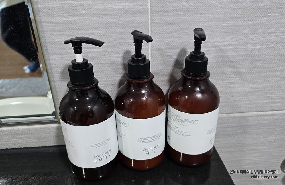 대용량 어메니티와 딱 4인가족이 2회 사용할 수 있는 분량의 치약이 놓여 있습니다.