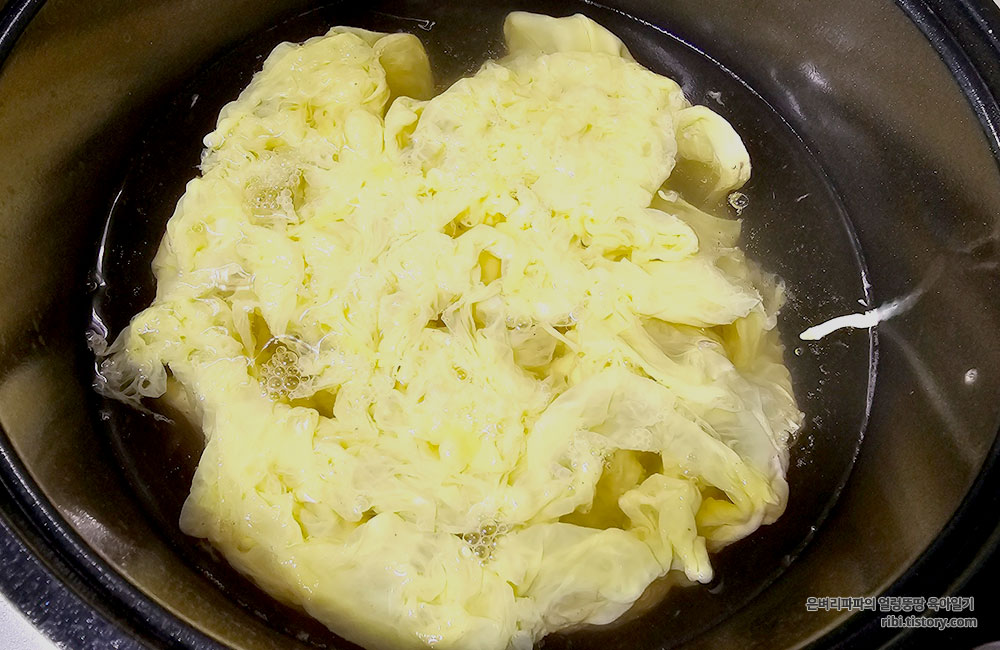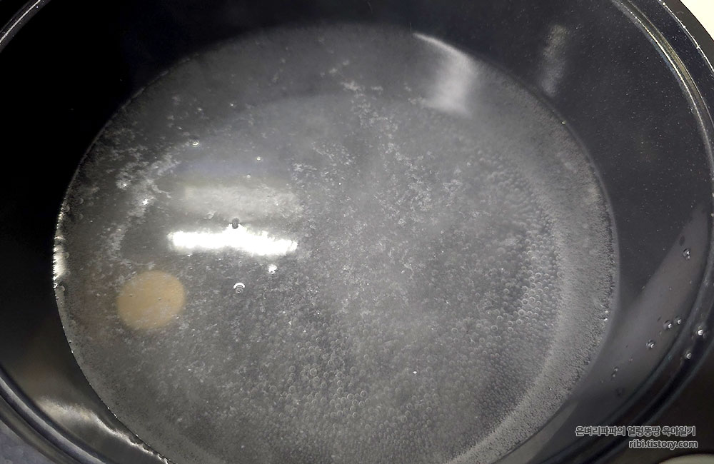 물이 끓으면 미리 준비한 계란물을 부으면 되는데... 끓는 상태 그대로 계란물을 넣으면